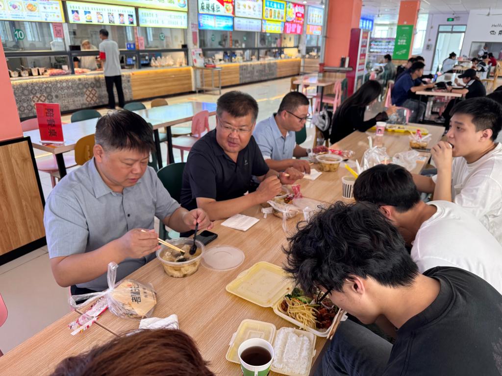 同学们纷纷就食堂菜品种类、营养搭配、就餐环境等方面提出自己的感受与建议。王院长认真倾听,并对同学们关心的问题一一作出回应,现场气氛轻松而融洽。一位参与就餐的大一学生表示;“能这样近距离地和院长交流,感觉特别踏实,也更有信心把生活中的建议反馈给学校。”